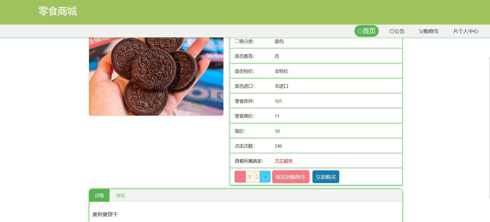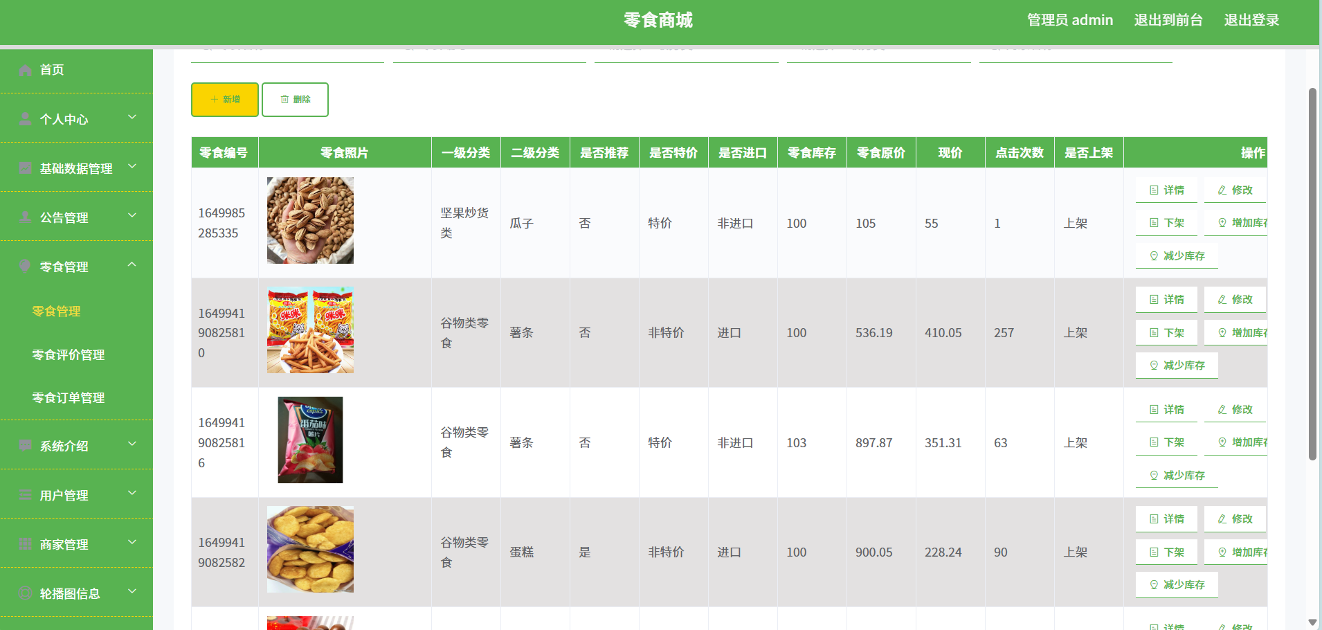 管理员可进行零食类型、商品信息、订单与商家管理;商家负责上架、库存及订单处理;用户则可在前台完成浏览、下单、评论、收货等操作。
