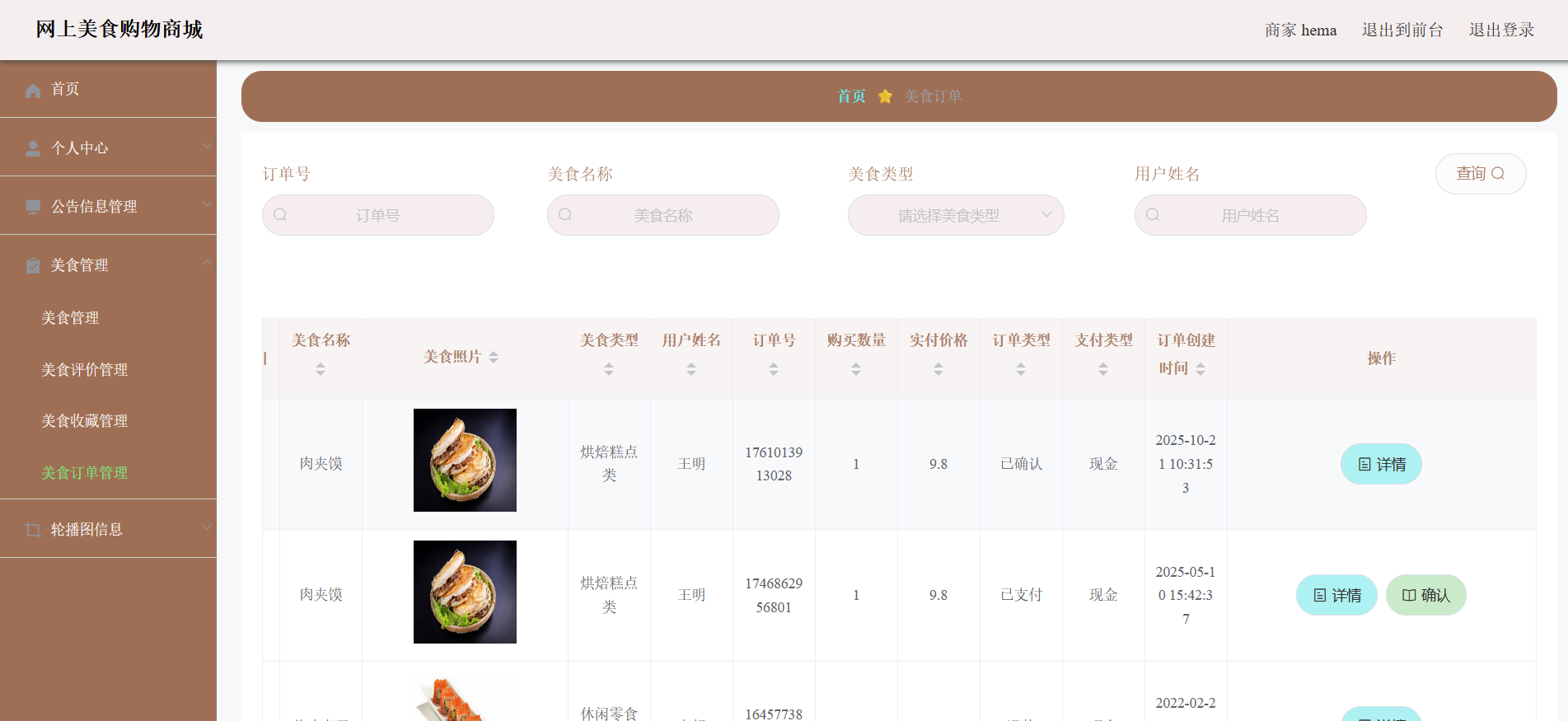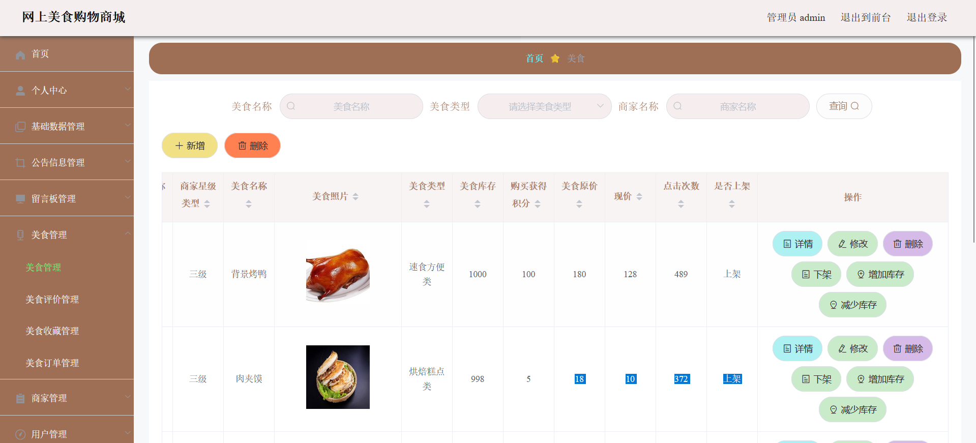 管理员可进行美食类型、商品信息、订单与商家管理;商家负责上架、库存及订单处理;用户则可在前台完成浏览、下单、评论、收货等操作,用户购买商品时根据会员等级付款时进行打折处理。